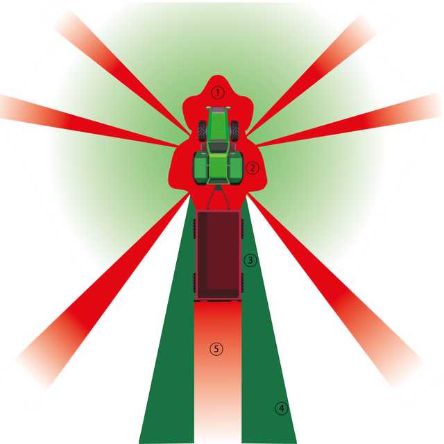 Op de foto rechts een illustratie van de dodehoeken van een landbouwvoertuig uit het verkeerseducatieprogramma veilig met landbouwverkeer.